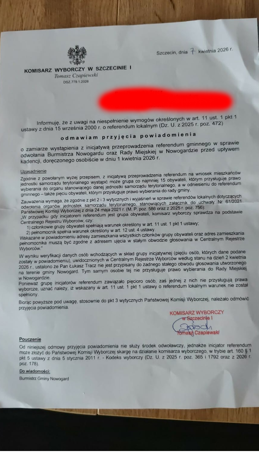 1 kwietnia inicjatorzy referendum złożyli kolejny wniosek o odwołanie Burmistrza i Rady Miejskiej. Nauczeni doświadczeniem, zrobili wszystko „na tip-top”: dokumentacja sprawdzona, adresy zweryfikowane z centralnym rejestrm. Mało tego! Do wniosku dołączono oficjalny wypis z Centralnego Rejestru Wyborców z dnia 31 marca, który czarno na białym potwierdzał, że cała piątka inicjatorów to pełnoprawni wyborcy z Nowogardu.